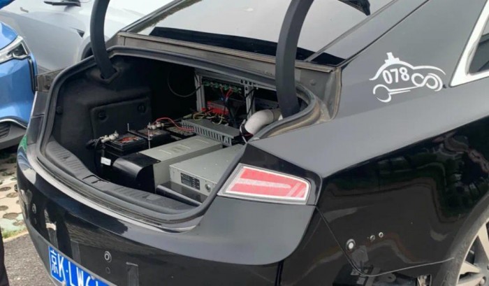 车东西在百度 Apollo Park 拍到了该款车的后备箱,可以看出,车辆后备箱里被大大小小的硬件所填满,这就是整车计算系统的所在之处。这些计算硬件全部处于一个狭小封闭空间内,需要大功率的风冷设备才能满足硬件的散热需求,以此保证系统的正常运行。