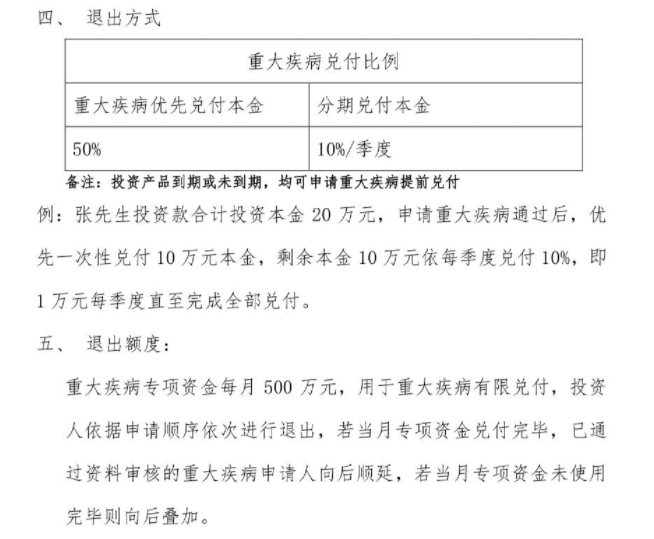据悉,重大疾病专项资金每月为500万元,投资人依据申请顺序依次进行退出。