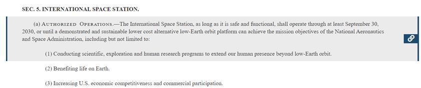 《2021推进载人航天法案》中给国际空间站续命的条文