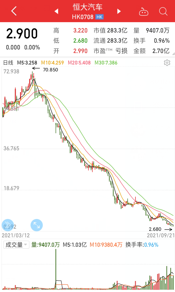从4月份至今,恒大汽车股价一路下滑,截止到9月21日收盘,恒大汽车报收2.9港元,股价暴跌超95%。