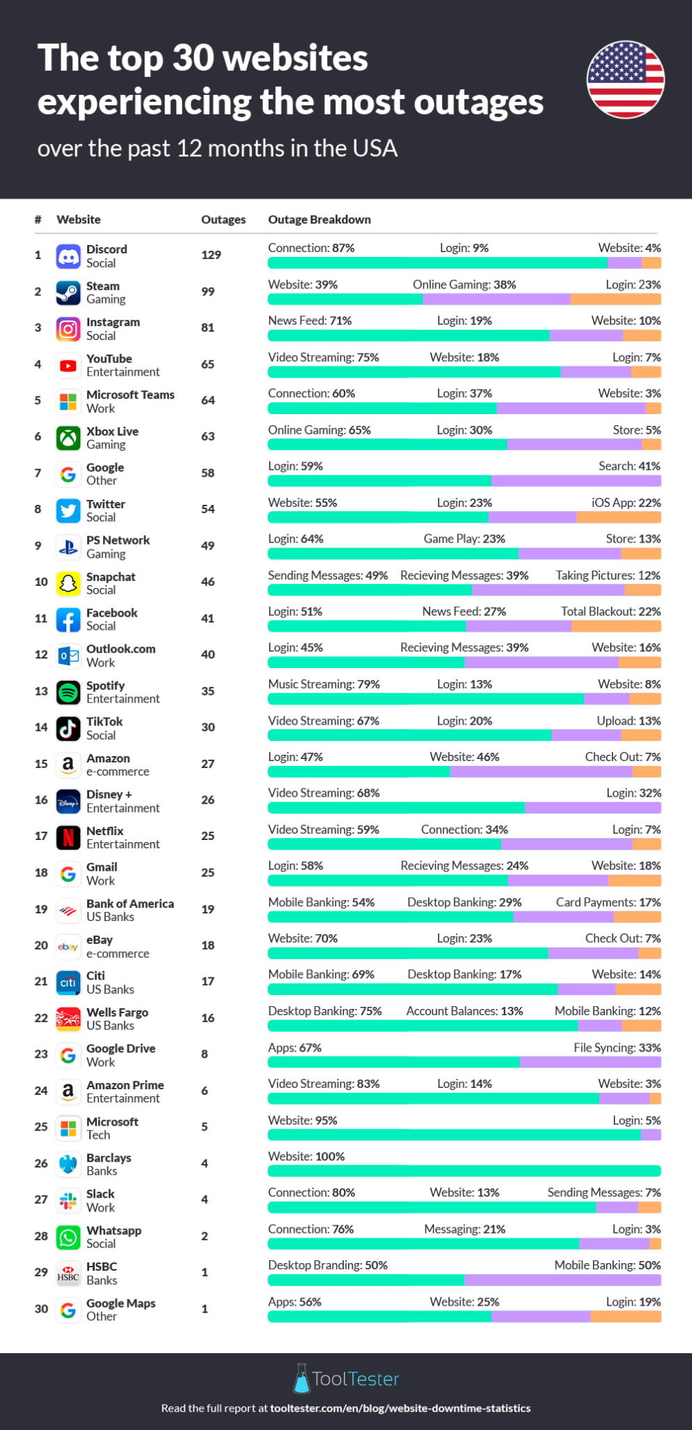 ToolTester 最近发布了一份列表,其中列出了在截至 2021 年 6 月 25 日的 12 个月期间,服务中断最多的 30 个网站。