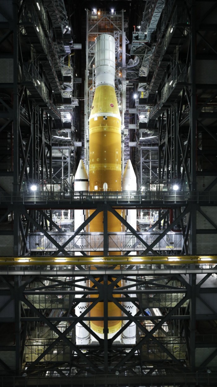 新的图像来自于NASA在宽敞的装配大楼内进行的脐带塔脱离和缩回测试 (URRT) 测试。