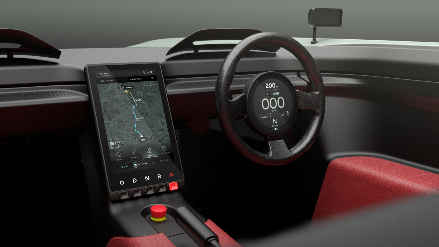 在汽车内部,Aura团队希望以这样一种方式塑造现代技术,鼓励而不是分散对前方道路的密切关注。关键信息如剩余续航里程和天气则集中在方向盘内部的一个5英寸的自动调平圆形显示器。显示屏通过一台运行Android Automotive的中央计算机跟10英寸导航信息娱乐屏幕协同工作。计算机分析驾驶条件、司机配置、附近的充电站和其他因素以优化能源使用、管理时间和指导司机沿着路线到充电站。