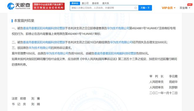 裁判结果为被告阳光电脑科技立即停止侵害原告华为公司第 4924861 号 “HUAWEI” 注册商标专用权的行为,并赔偿原告华为公司经济损失及合理支出 5000 元等。