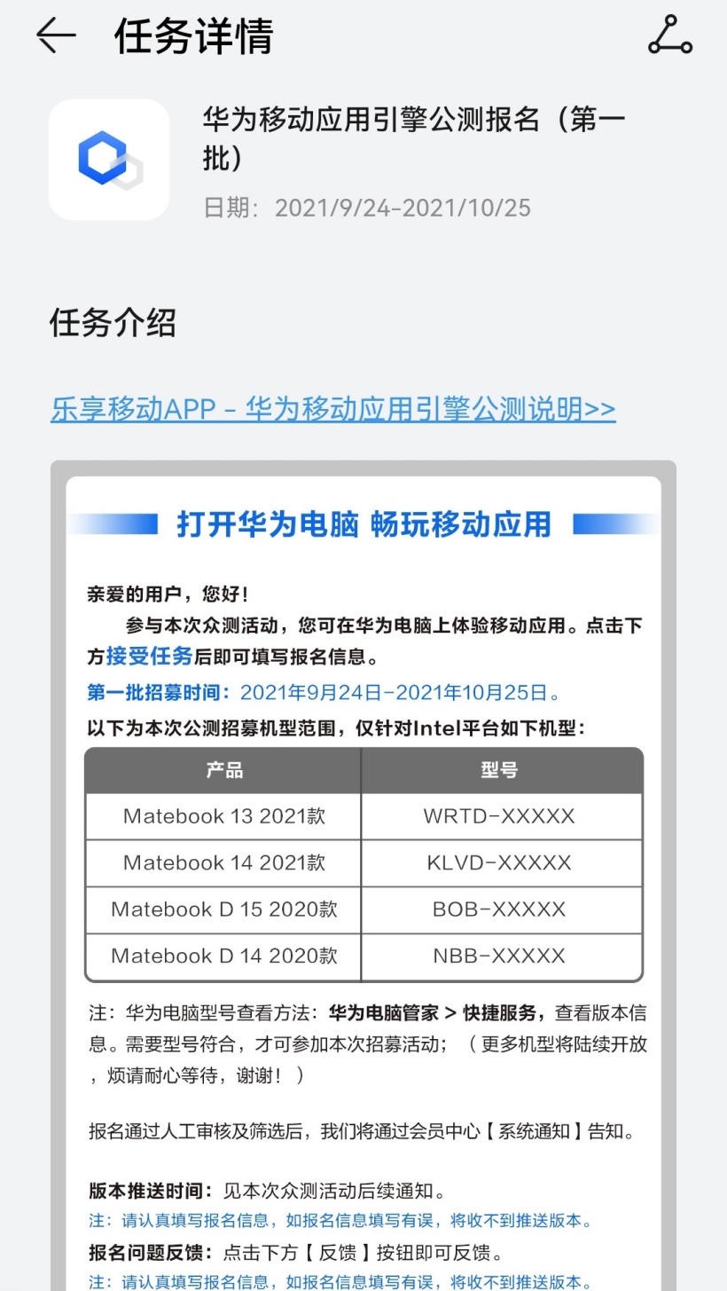 根据华为官方消息,目前华为移动应用引擎已经正式开启公测报名,首批支持四款Intel平台机型,分别为:HUAWEI MateBook 13 2021款、HUAWEI MateBook 14 2021款、HUAWEI MateBook D 14 2020款、HUAIWEI MateBook D 15 2020款。