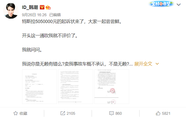 韩潮发布的起诉书显示,原告(特斯拉)表示被告(韩先生)应立即停止对所有侵权原告名誉权的行为,删除社交平台发表的内容。被告在社交平台置顶位置连续三十日向原告赔礼道歉。被告赔偿原告经济损失500万元,被告承担原告因侵权行为而产生的合理维权支持5万元,共计505万元。