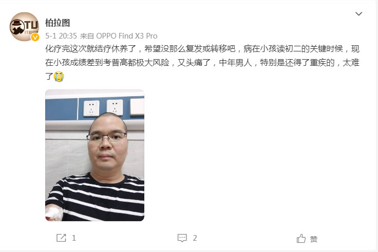 柏拉图在微博里说到:化疗完这次就结疗休养了,希望没那么复发或转移吧,病在小孩读初二的关键时候,现在小孩成绩差到考普高都极大风险,又头痛了,中年男人,特别是还得了重疾的,太难了。