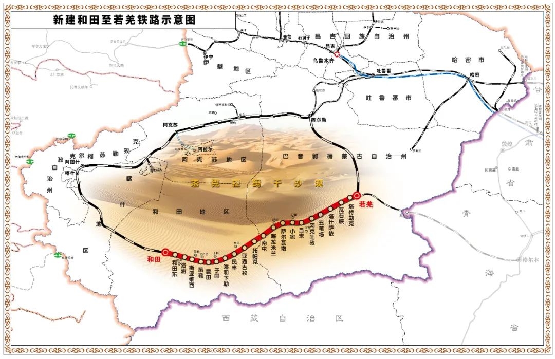 它们与南疆铁路、格库铁路共同构成环塔里木盆地铁路环线,也是继去年北疆铁路环线形成之后,新疆的又一条铁路大环线。