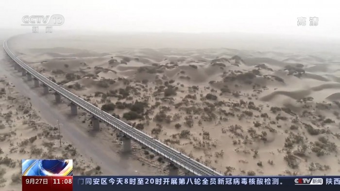 截至目前,铁路沿线共修建草方格近5000万平方米,种植梭梭树、红柳、沙棘等灌木和乔木近1300万株,植物成活率85%。