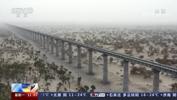 为了建好这些过沙桥,建设者使用了装配式混凝土结构应用技术,改变了以往现场浇筑桥墩的做法,破解了沙漠铁路建设中风沙影响、自然环境恶劣、用水难及混凝土养护难等建设难题。