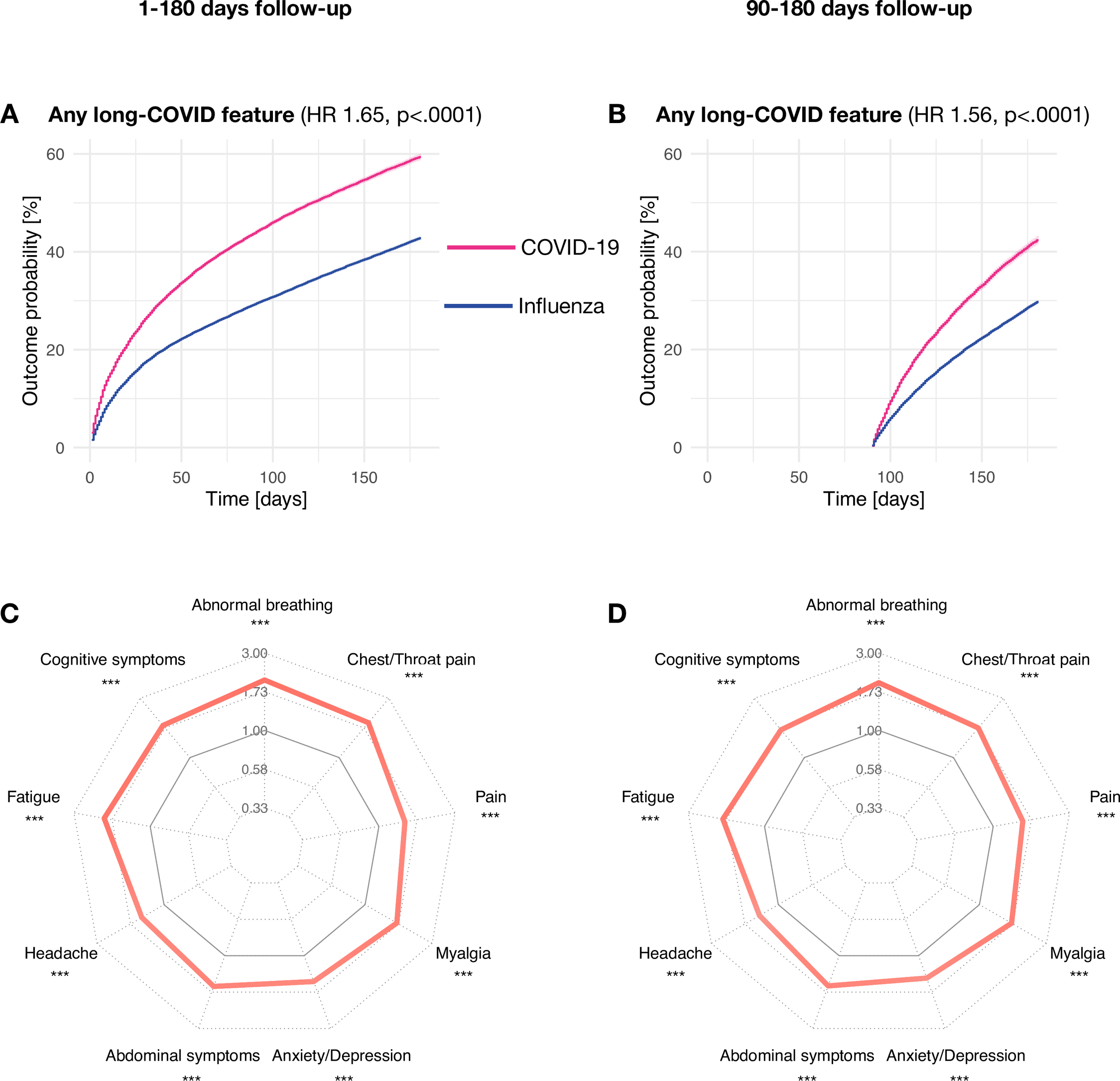 牛津大学研究中的一个有趣的发现是将持续的long COVID症状的流行率与那些经历流感长期症状的人进行了比较。研究人员发现一些流感病例报告说至少有一种症状在急性感染后持续了六个月,但长期症状在COVID-19病例中更为常见。事实上,与流感病例相比,COVID-19病例出现长期症状的可能性大1.5倍。