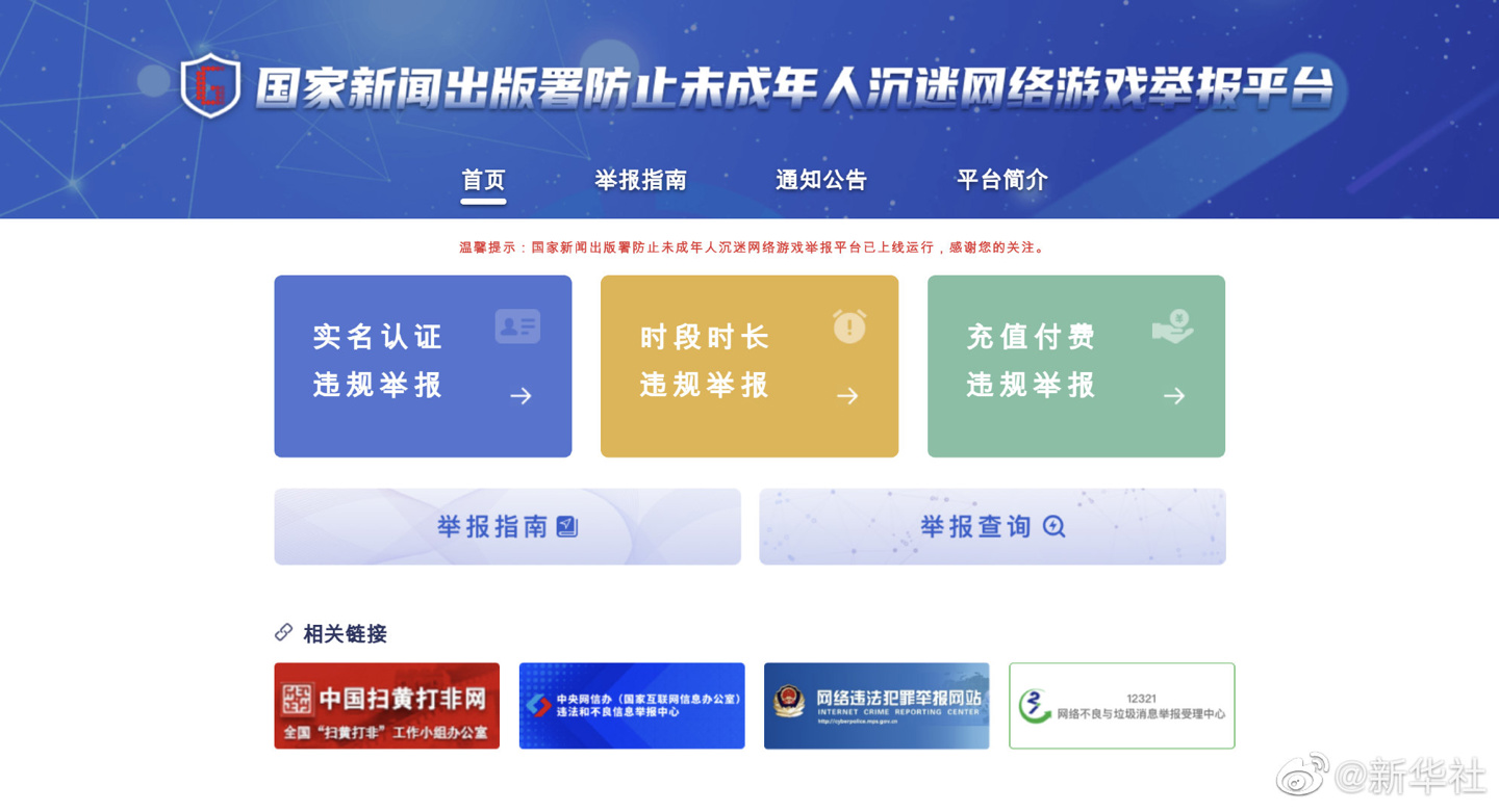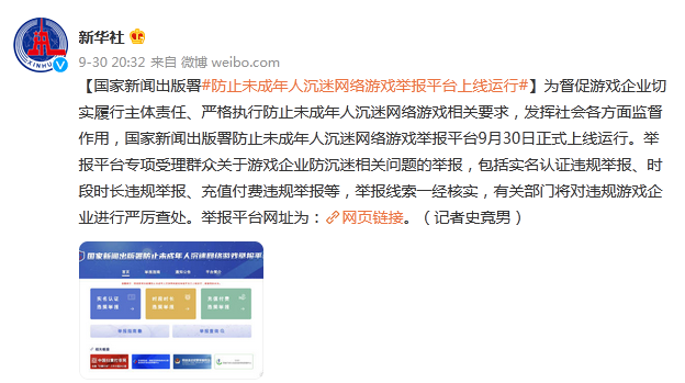 为督促游戏企业切实履行主体责任、严格执行防止未成年人沉迷网络游戏相关要求,发挥社会各方面监督作用,国家新闻出版署防止未成年人沉迷网络游戏举报平台9月30日正式上线运行。