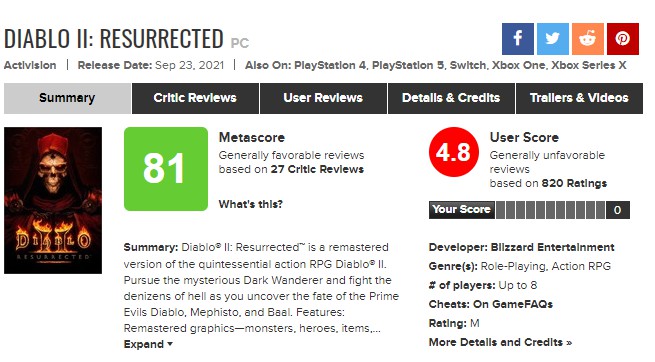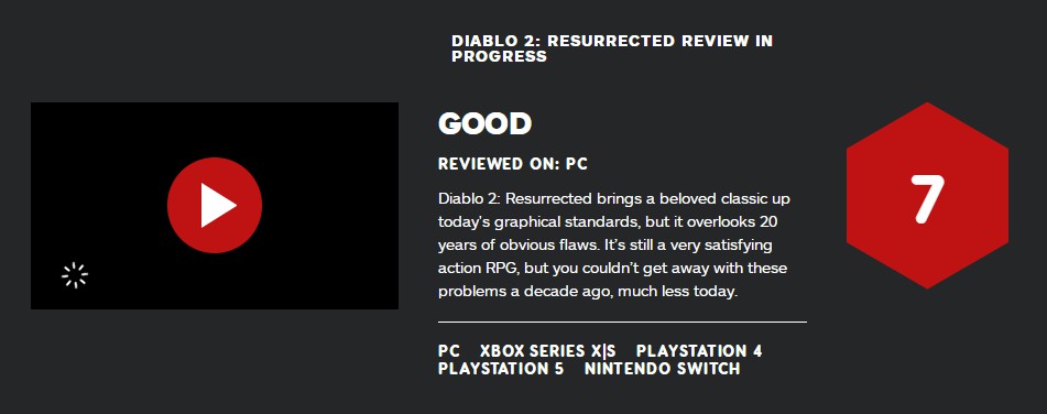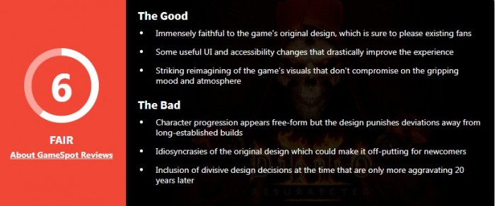 IGN给《暗黑破坏神2:重制版》打出了7分的评价、GS则打出了6分,较为统一的评价就是:本作忠于原作但落后时代。《暗黑破坏神2:重制版》将一部深受玩家喜爱的作品提升到了当今的画面标准,但它忽略了20年来明显的缺陷。这仍是一个令人满意的ARPG,但几十年前没能摆脱的问题,现在当然也不会再去摆脱了。
