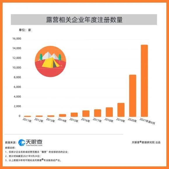 从社交平台“刮”起来的这股露营风,迅速引导了相关产业链的发展。天眼查App数据显示,2019年及2020年,新增露营相关企业数量分别为2877家和8713家,2020年新增数量同比增长约202.85%;而2021年前9个月,新增企业数量高达约1.5万家,近乎成倍增长。