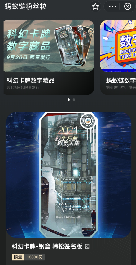 这个小程序,就是贩售数字手办的平台。当然,这个平台不只是售卖数字手办这一类产品,各种数字类的“艺术品”,都有贩售。比如,最近在出售的,就是“科幻卡牌数字藏品”,其中还有不少限量发售的签名款。