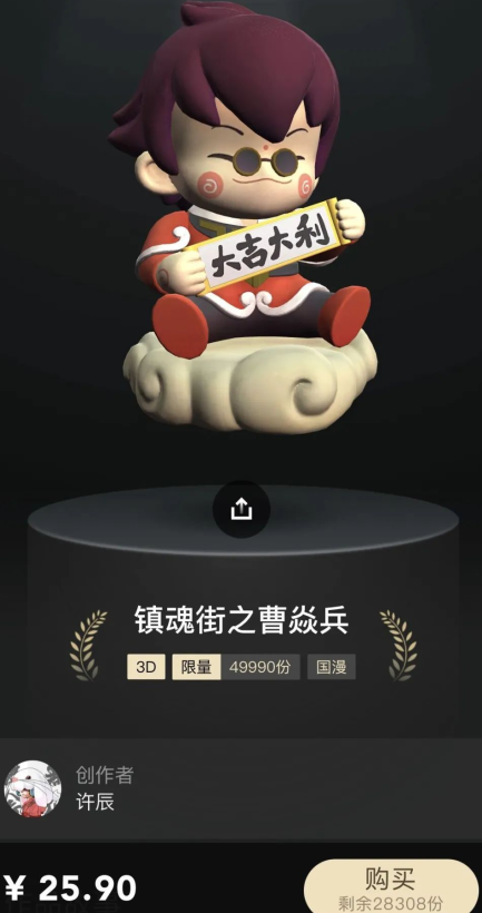 得知这类虚拟手办的存在,还是微博上。9月22日,《镇魂街》的官方微博发布了一条消息,称“《镇魂街》数字手办”,将通过“蚂蚁链”限量发售。这次的数字手办,共有三款——“曹焱兵”、“曹玄亮”、以及“许褚”。每款售价也不贵,均在20块钱左右。