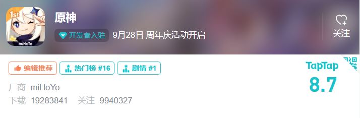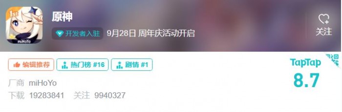 如今,《原神》TapTap评分已经来到了8.7