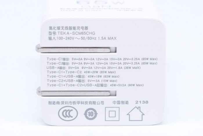 插脚所在面印着具体的参数信息,铁甲65W氮化镓无线智能充电器的具体型号为TEKA-SCM65CHG,支持100-240V的宽电压输入,制造商为深圳市铁甲科技有限公司。中国制造。