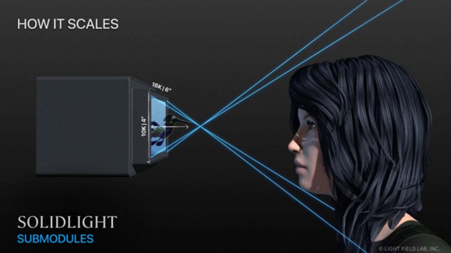 卡拉芬说道:“这令人感到非常兴奋,因为很长一段时间以来,我们一直在寻找一种能够用光线创建对象的全新方法。我们可以向你证明我们已经实现了这一点,现在我们要扩展它以构建更大的对象 。”Light Field Lab 必须用产生全息图的小型子模块/全息砖块来组装显示器,亦即 SolidLight Surface。 每个子模块/全息砖块是 16K × 10K 像素,而子模块/全息砖块的显示表面是 6 英寸乘 4 英寸。