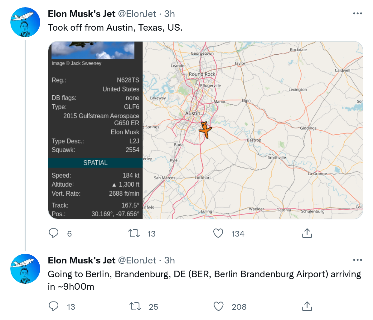 全球首富就是忙,刚刚在德州奥斯汀工厂开完特斯拉股东大会的马斯克已起程飞往德国,去参加周六将在柏林工厂厂址举办的一次大型活动。据追踪马斯克私人飞机飞行轨迹的一个Twitter账号称,他的飞机已从德州奥斯汀起飞,前往德国首都。