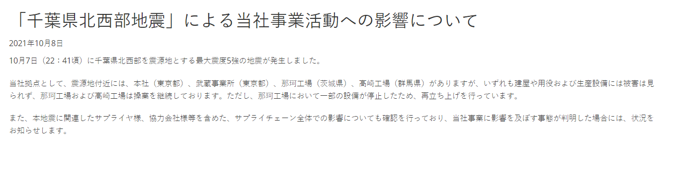 据媒体报道,瑞萨总部(东京都)、武藏事业所(东京都)、那珂工厂(茨城县)和高崎工厂(群马县)皆位于震源附近,厂房与生产设备均未因地震受损。
