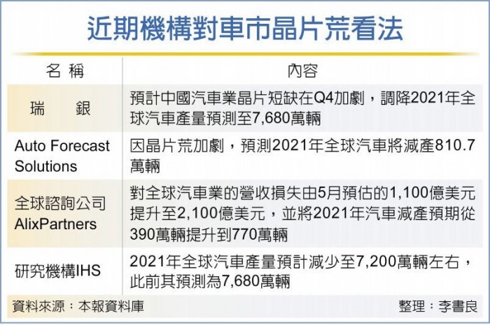 瑞银表示,中国为全球汽车制造重地,其生产受到干扰将拖累全球产量,该行估计,在第三季淡季的全球分配上,芯片缺口导致月产量减少10万至20万辆,到了第四季旺季,影响可能轻易就会达到20万至40万辆。
