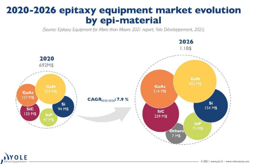 截至2020年,外延设备销售额约为6.92亿美元,预计到2026年将增长至11亿美元,平均年复合增长率为8%。然而,报告承认,这些数字并没有充分说明外延设备在汽车消费类以及航空航天和国防等细分市场中的关键应用中的活力和普遍性,而且大批量制造商(HVM)采用的外延设备往往来自一些非主流供应商。