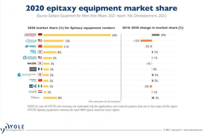 报告分析,如今只有极少数设备供应商能够满足对设备的高需求。对此,Yole列举了11家外延设备的主要供应商,领先的三家是德国Aixtron(爱思强)、美国Veeco、中国AMEC(中微半导体),按照营收来算,这三家超过了总市场份额的60%。