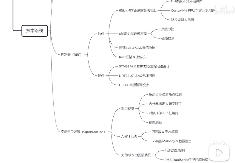整套设备的电路设计相当复杂,涉及了电源模块、电机驱动、计算模块、通信系统等等。实际上这台机械臂上光各种型号的MCU就有12个,而且为了使后续的扩展性足够强,且交互方面能够做一些很有意思的创新,在机体上搭载了Wifi,蓝牙,2.4G等很多种无线能力。电路方面最主要的是主控制器和电机伺服驱动器,其中后者为了电机一体式的驱动,支持CAN总线和功率机联,所以整套系统将所有的6个电机以及末端执行器连接起来,仅需要4根线。这款驱动器的性能可以说非常暴力,方案使用的是FOC加斩波恒流。由于添加了高精度的磁铁编码进行闭环控制,所以不会存在传统步金电机丢步的风险。同时在最高转速和效率方面,也不是3D打印机上那种驱动器能比拟的。如果说驱动器是心脏的话,那控制器就是机械臂的小脑了。在这个项目中,稚晖君使用了之前设计的机器人开发框架REF、基于Corte-M4内核的MCU。提到这,稚晖君还是考量到后期的性能扩展性,凭借M4自带FPU和DSP的内核,为后面的控制算法中实现涉及到的大量复杂计算,展现出明显的效率提升。另外主控制器采用冗余设计。除了主控制器REF外,还板载了一个ESP32作为协处理器。一方面作为STM32的安全备份,另一方面可以用于提供wifi蓝牙等无线能力。总之为了解决最开始提到的精度和性能问题,解决方案就是:三、软件设计