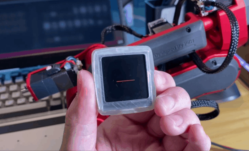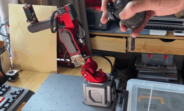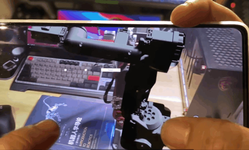 回到硬件设计阶段,如果合理地设置减速器的减速比,这台机械臂就可以在保持力矩和精度的同时进行反驱,所以获得了一个手动协作示教的功能。只需要手动教它一遍运动的流程,它就可以自动学习重复。手动示教,其实是很多协作机器人都有的功能,并不算炫酷。值得一提的是开启示教功能的方法,整个机械臂的机身,除了一个电源按钮,没有别的按键,那么如何进行各种功能的切换呢?一方面是通过动力学模型进行自动检测,另外可以通过示教器开启。在方案中,稚晖君设计了一个无线智能小终端,也是这台机械臂的伴侣,它可以通过低功耗蓝牙和机械臂进行无感连接,连接之后可以实时显示机械臂的各种状态信息,以及切换各种功能,比如进入示教模式。在新方案中,是不是可以结合一些比较前沿的技术,比如AR增强现实技术,在上位机中无法展示真实的环境,实现指哪打哪的效果?AR环境中的机械臂效果