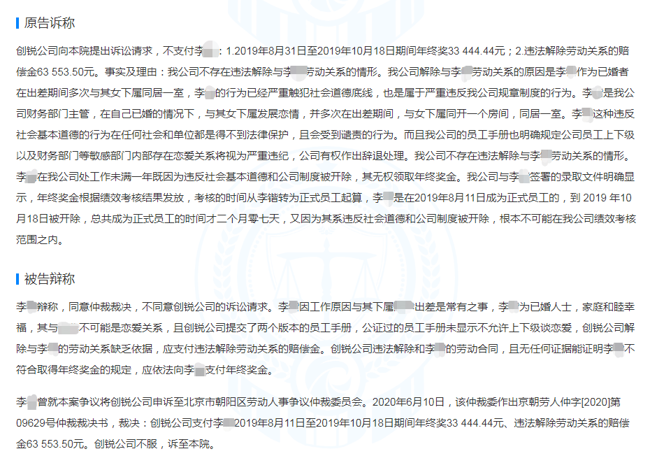 李某辩称,与该下属并无恋爱关系,就本案争议将创锐公司申诉至北京市朝阳区劳动人事争议仲裁委员会。该仲裁委裁决创锐公司支付李某年终奖 33444.44 元、赔偿金 63553.50 元。创锐公司不服,诉至法院。