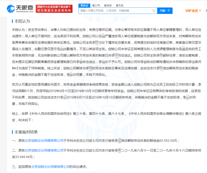 天眼查 App 显示,近日,聚美优品关联公司北京创锐文化传媒有限公司新增一则被执行人信息,执行标的 96998 元,执行法院为北京市朝阳区人民法院。关联判决书显示,创锐公司以李某作为已婚者在出差期间多次与其女下属同居一室,行为严重触犯社会道德底线,亦严重违反公司规章制度为由解除劳动合同。
