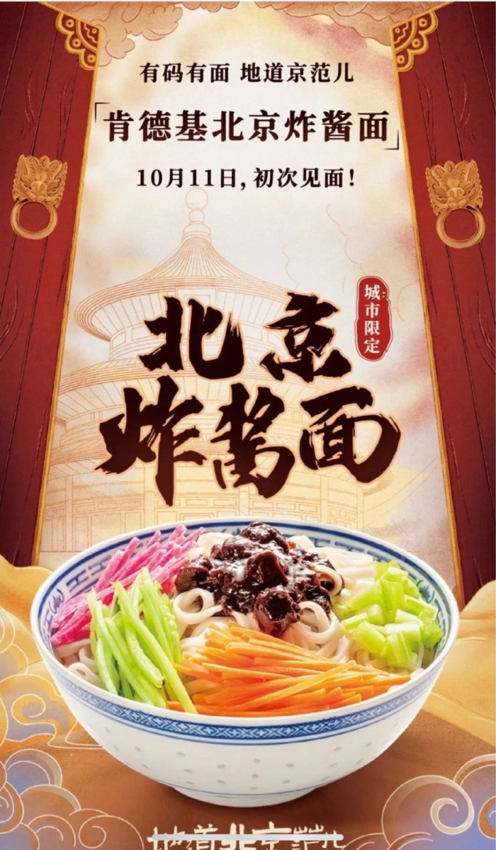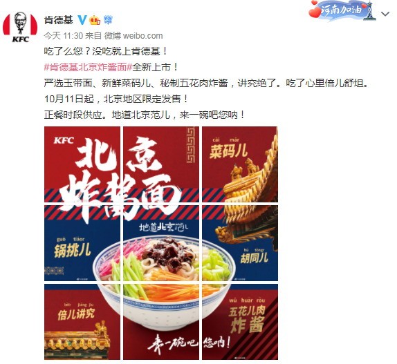 今日(10月11日)肯德基官方微博上宣布,肯德基新品北京炸酱面上市,从今天开始在北京地区限定发售。地道北京范儿,快来尝尝。