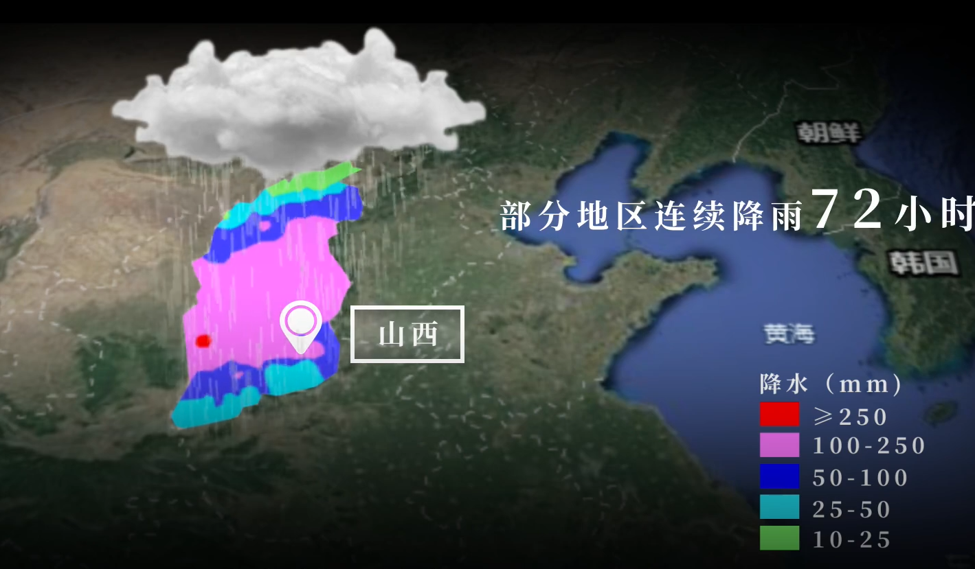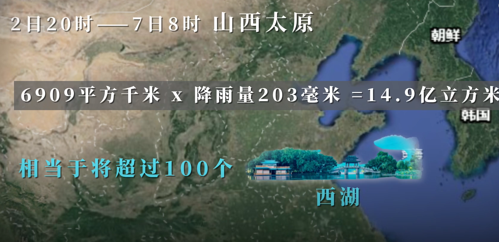 10月2日20时到10月7日8时,山西全省连续遭遇强降雨,最大雨量285.2毫米,117个县(市、区)中有18个降水超过200毫米,不少地方甚至连续下了72个小时。在省会太原,三天降水量达203毫米,相当于将大约100个西湖的水量直接倒入城市(视频)。