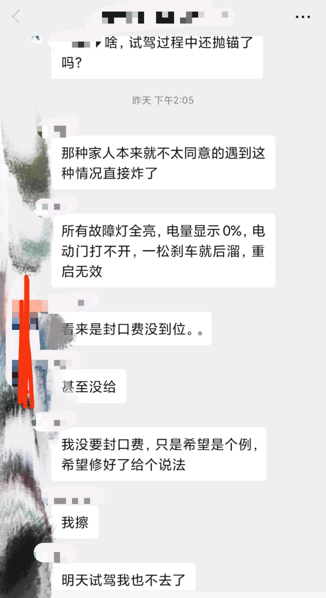 网传的聊天记录截图显示,当事人称,“事发时故障灯全亮,电量显示0%,电动门打不开,一松刹车就后溜,重启无效。”并表示,“我没要封口费,只是希望是个个例,希望修好了给个说法”。