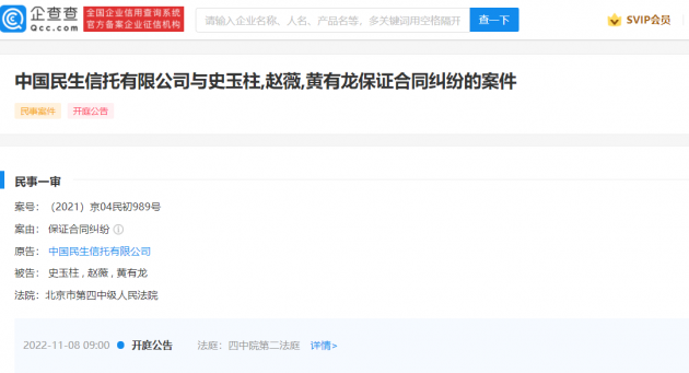 企查查 APP 显示,近日,中国民生信托有限公司(简称民生信托)新增开庭公告。中国民生信托有限公司与史玉柱,赵薇,黄有龙保证合同纠纷的案件将于 2022 年 11 月 8 日开庭,案号 (2021) 京 04 民初 989 号,原告为中国民生信托有限公司,被告赵薇,黄有龙(赵薇丈夫)以及巨人网络史玉柱,案由为保证合同纠纷。