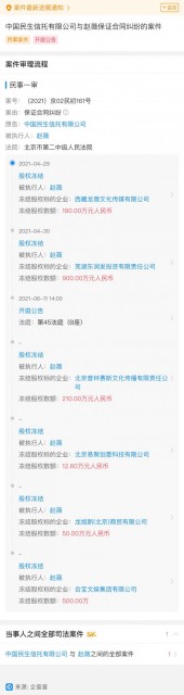 此外,值得一提的是,企查查 APP 显示,今年 6 月 11 日,民生信托起诉赵薇一案,已于北京市第二中级人民法院第 45 法庭开庭审理。该案被告为赵薇、合宝文娱集团有限公司,案由同样为保证合同纠纷。在此案司法协助信息中,赵薇持有合宝文娱 4.15% 的股权被冻结,涉资 500 万元。
