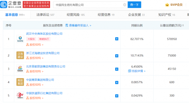 据官网显示,民生信托为泛海集团旗下投资机构,前身为中国旅游国际信托投资有限公司,企查查 APP 显示,该公司注册资本 70 亿元,控股股东为武汉中央商务区股份有限公司。