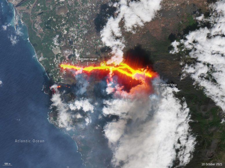 在10月10日拍摄的令人惊叹的新图像中,哥白尼哨兵2号任务拍摄到了从 Cumbre Vieja火山喷出的新的熔岩流。这张Sentinel-2的图像已经被处理成真彩色,使用短波红外通道来突出新的熔岩流。