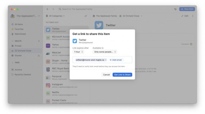 Psst!允许你与任何人分享凭证,通过生成一个信息链接,其他人可以访问,即使他们没有 1Password 账户。你可以选择链接的有效期,从一小时到 30 天不等,之后会自动过期。你还可以选择与任何拥有该链接的人分享凭证,或者只与特定的人分享。如果你选择后者,该服务将要求接收者在给他们访问权之前通过验证他们的电子邮件地址来确认他们的身份。