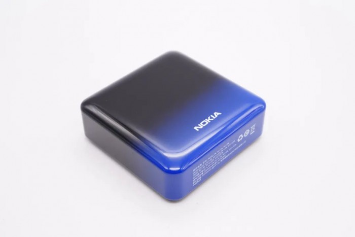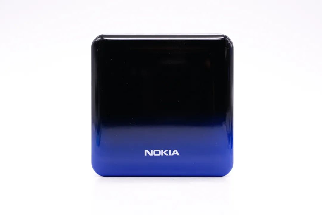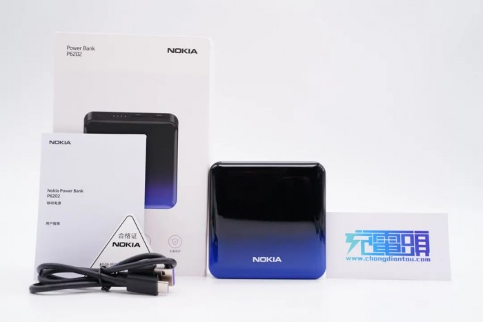 诺基亚这款移动电源外形方正,塑料外壳经过亮面处理,正面为黑色和蓝色的渐变色,并印有 NOKIA 的品牌 logo。