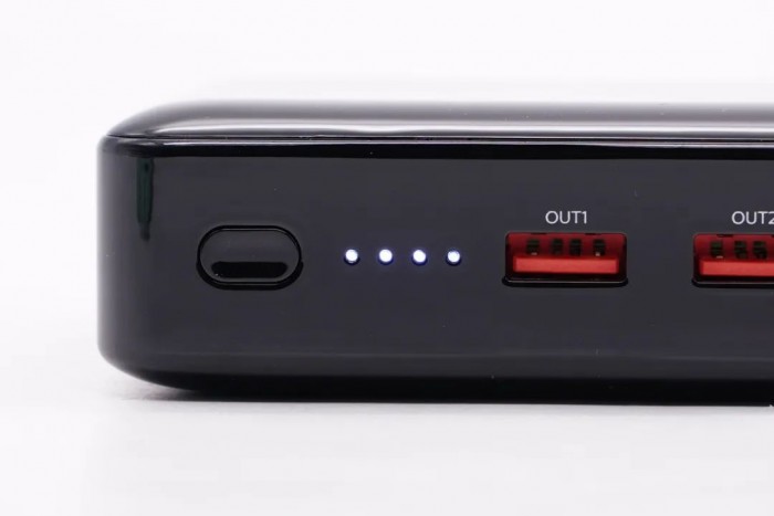 顶部设有两个橙色胶芯的 USB-A 接口、四颗 LED 电量指示灯和一颗电源按键。
