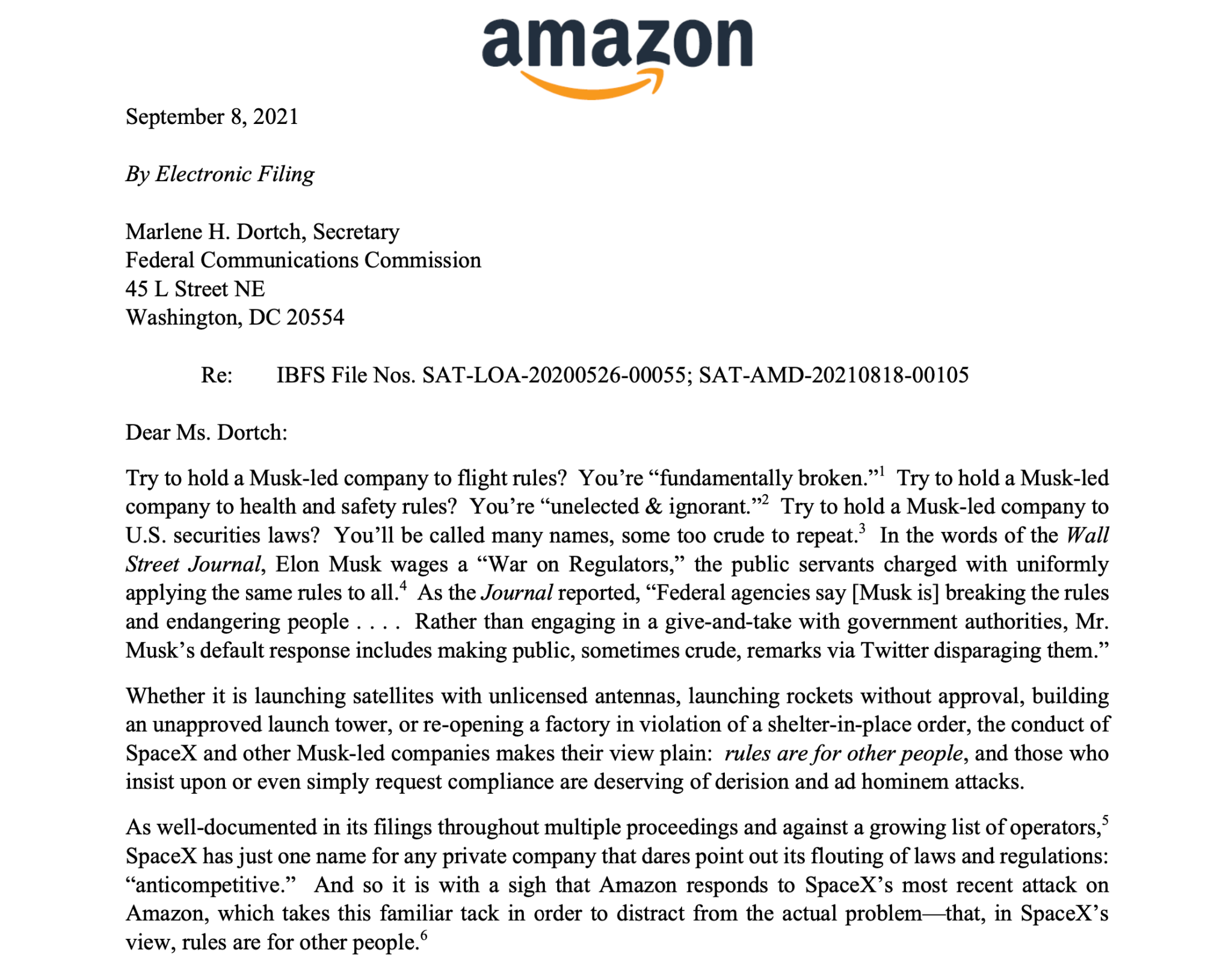 据悉,亚马逊在SpaceX提交修改后的申请后几天就开始反对Starlink的第二代卫星。在最初的论证中,亚马逊(即Kuiper)告诉FCC,SpaceX新计划违反了FCC的两项独立规则。这些规则属于FCC《卫星通信准则》第25部分里面的内容,其规定了申请被接受备案的要求并规定了为此必须解决的领域。