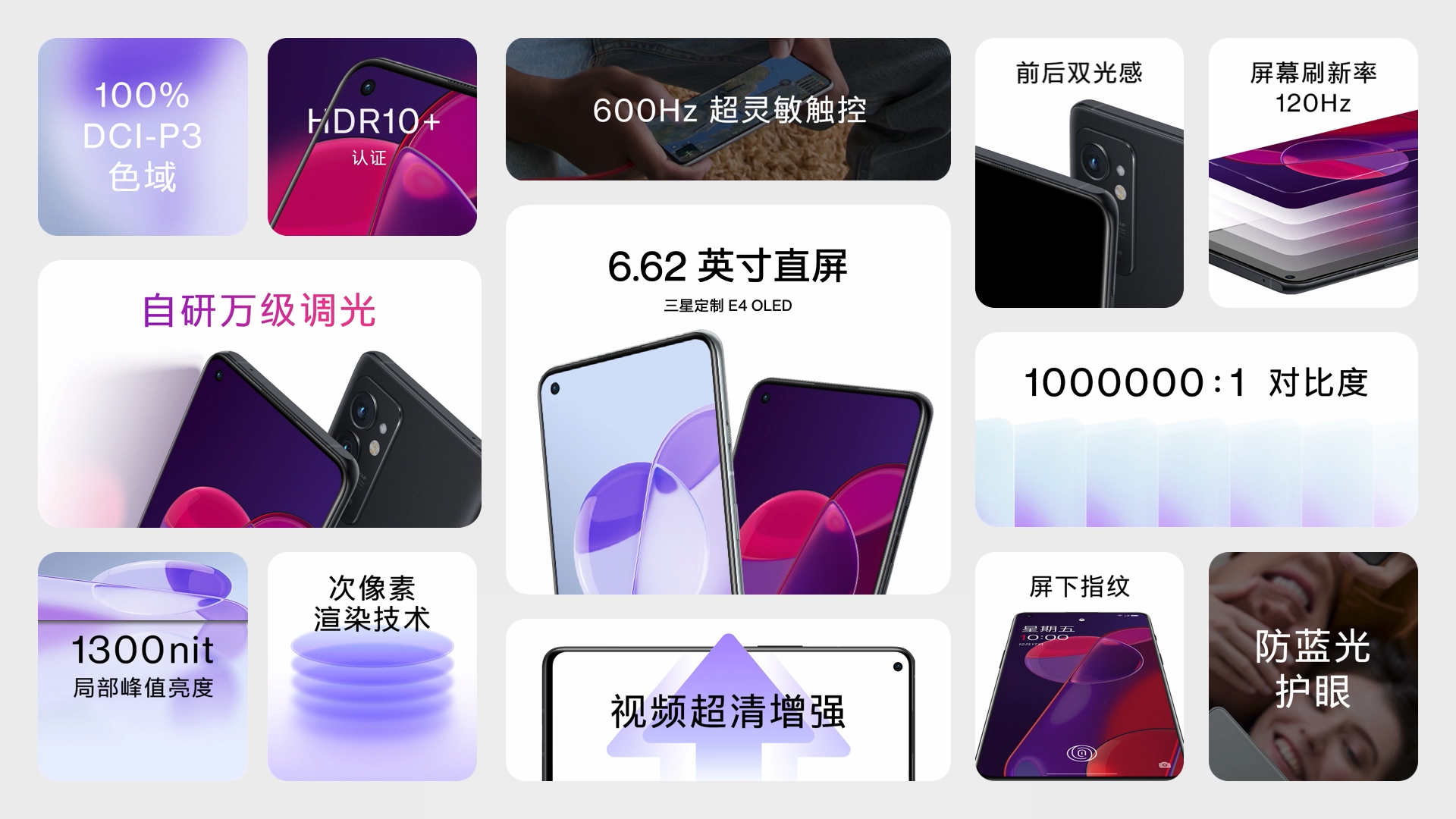 一加9RT屏幕部分,搭载三星定制的6.62英寸E4 OLED直屏(提供600Hz 超灵敏触控,大幅度消除屏幕触控延迟),提供自研的万级调光算法,配合前后两颗光线传感器。