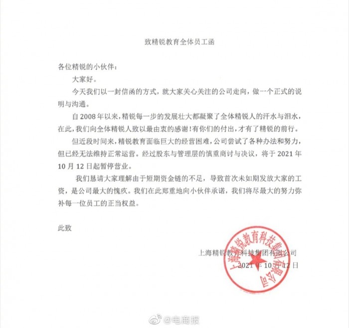 10月12日下午,精锐教育董事长办公室发布的一封致全体员工函称,近段时间以来,精锐教育面临巨大的经营困难,公司尝试了各种办法和努力,但已经无法维持正常运营。经过股东与管理层的慎重商讨和决议,将于10月12日起暂停营业。恳请大家理解由于短期资金链的不足,导致首次未如期发放大家的工资,是公司最大的愧疚。
