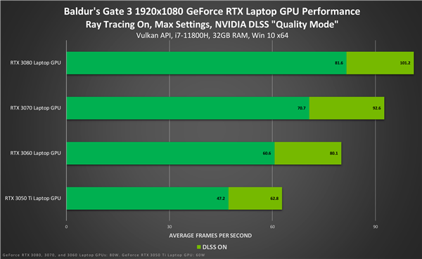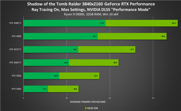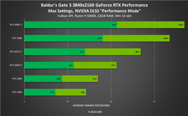 DLSS一大作用就是提高游戏性能,根据NVIDIA公布的10款新支持DLSS游戏的测试结果,少则提升40%以上的性能,《博德之门3》的性能最多提升88%,《古墓丽影:崛起》也提升了75%的性能。