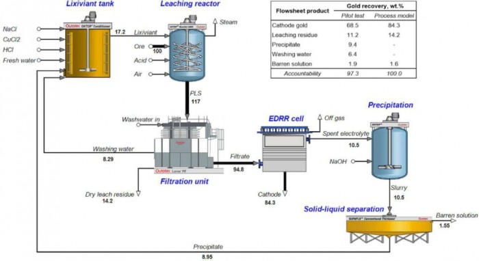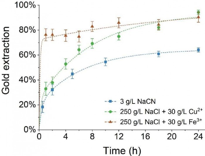 他继续说道:“通过我们的工艺,我们使用氯化物能够将黄金的回收率提高到 84%。相比之下,在我们的对照实验中,用标准的氰化物工艺处理同样的矿石,只能获得 64% 的收益”。