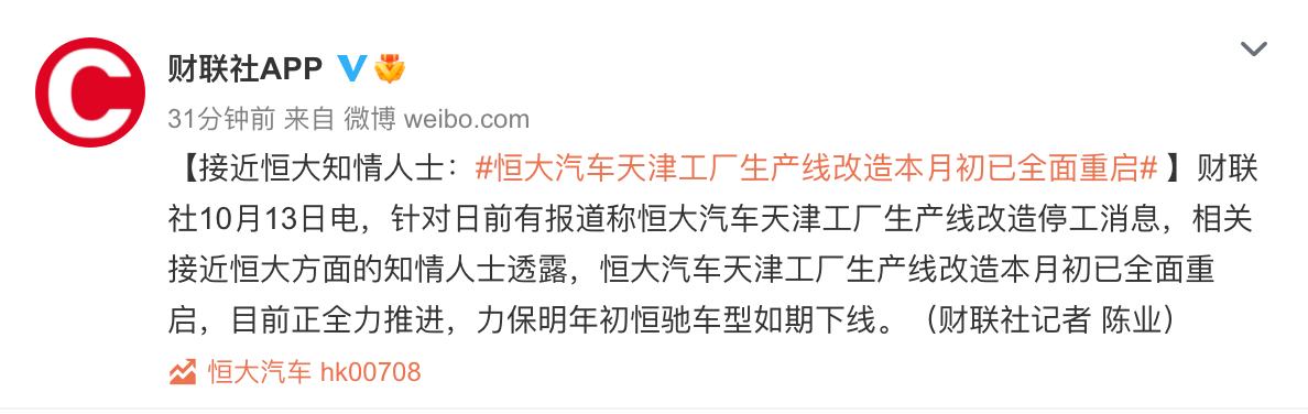 针对恒大汽车天津工厂生产线改造停工消息,接近恒大汽车的知情人士在接受财联社采访时透露,恒大汽车天津工厂生产线改造本月初已全面重启,目前正全力推进,力保明年初恒驰5如期下线。