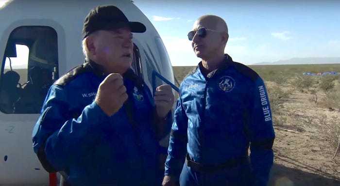 在完成了 11 分钟的太空之旅后,蓝色起源飞船在得州沙漠中着陆。夏特纳从飞船中爬了出来,情绪激动,立即与蓝色起源创始人杰夫·贝佐斯 (Jeff Bezos) 分享了他的感受。