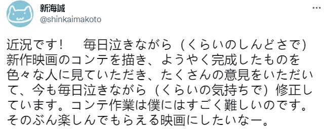 “近况!每天一边哭一边(费劲地)画新电影的分镜,好不容易完成的东西让很多人都看过了,得到了很多的意见,现在也每天一边哭一边(怀着这样的心情)修改。分镜工作对我来说非常困难。想拍一部能让人享受的电影。”